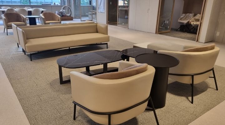 베이지와 그레이 톤을 중심으로 차분하고 신뢰감 있는 분위기를 구성했습니다. 직선형 소파와 라운드 테이블을 조합해 부드러운 상담 동선을 만들고, 우드 디테일로 공간에 따뜻함을 더했습니다. 장시간 체류에도 편안하도록 안정적인 비례와 절제된 컬러로 완성했습니다.