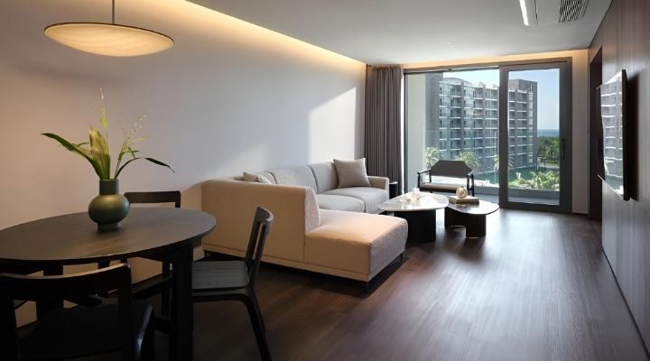 객실, 레지던스형 스위트 및 공용 라운지 공간 가구 프로젝트. 이동가구(소파, 라운지 체어, 다이닝 테이블, 체어, 커피 테이블)와 일부 제작가구를 설계·제작·납품.